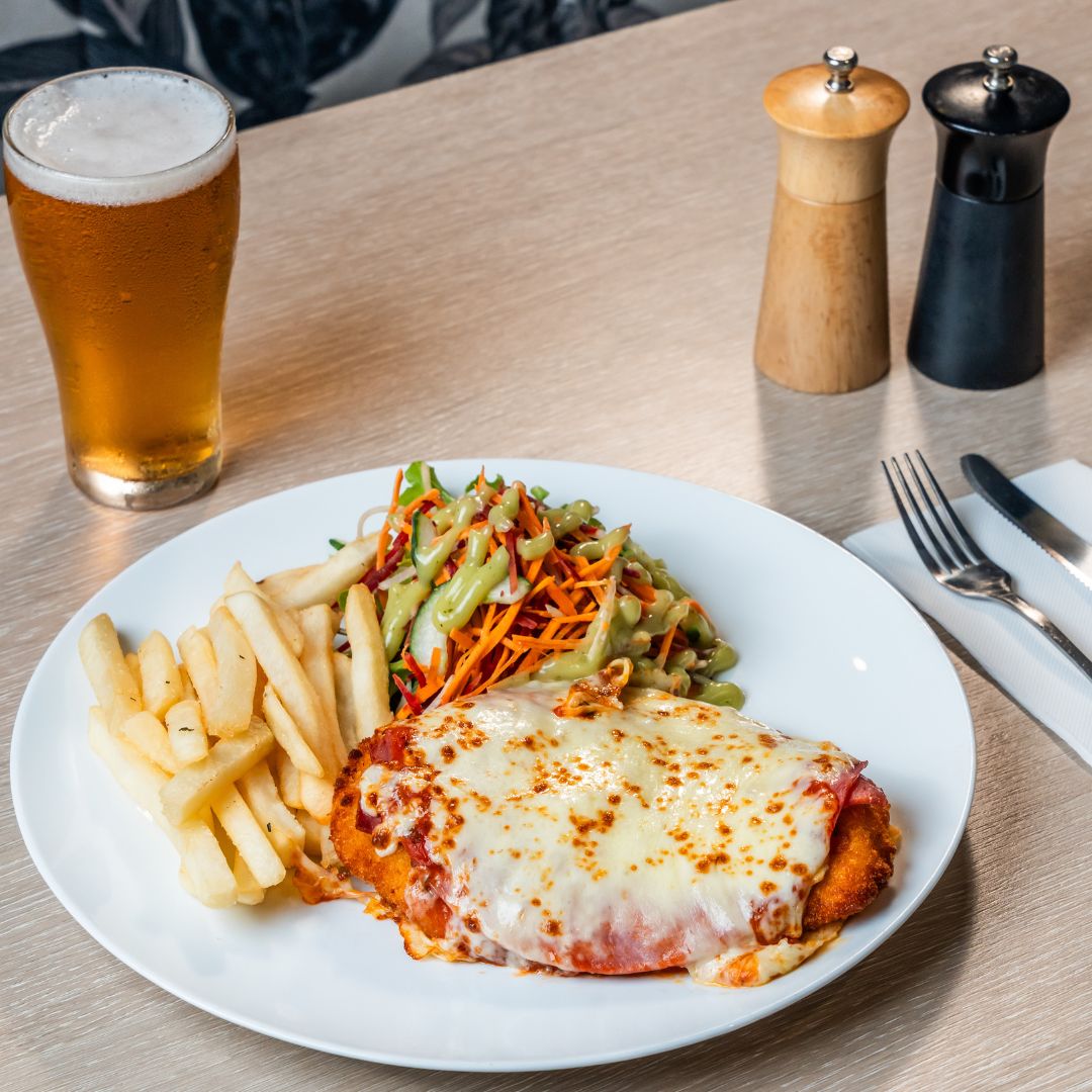Enjoy a Parmi with chips, salad and a schooner of beer.