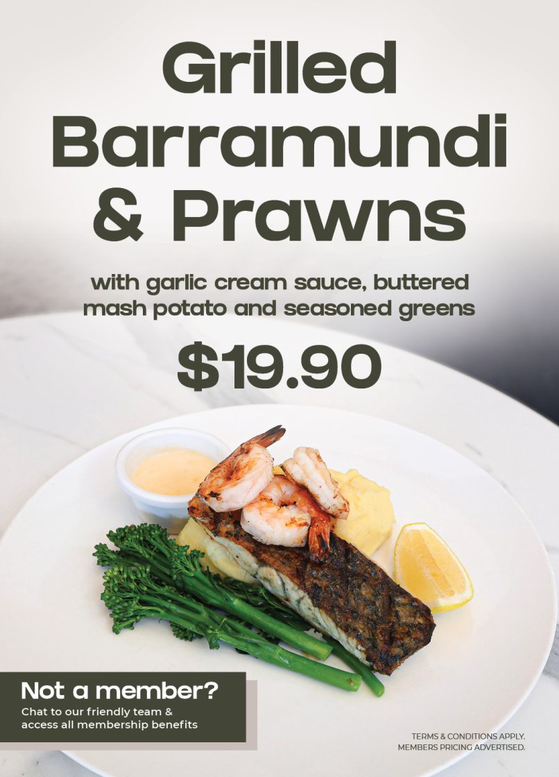 This February, enjoy Grilled Barramundi & Prawns with garlic cream sauce, buttered mash potato and seasoned greens.